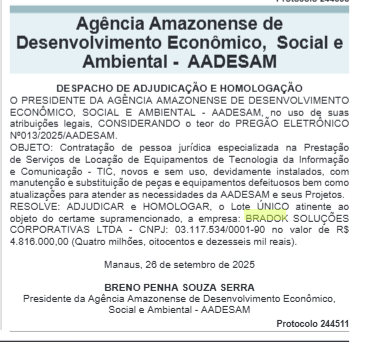 A Agência Amazonense de Desenvolvimento Econômico e Social (AADESAM), contratou por mais de R$ 4,8 milhões a empresa BRADOK SOLUÇÕES CORPORATIVAS LTDA, que possui atividade principal: fotocópias a famosa xerox. A contratação, segundo informações do documento publicado é para locação de equipamentos de informática e comunicação.