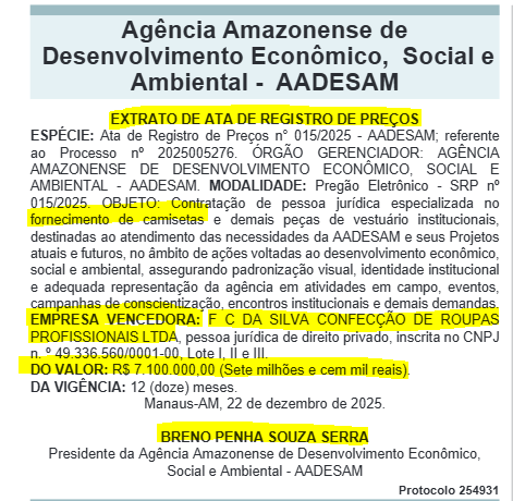 O extrato é assinado por Breno Penha Souza Serra, presidente da Agência Amazonense, e foi registrado no dia 22 de dezembro de 2025. Até o momento, não há informação pública sobre notas técnicas, estudos de demanda ou justificativas detalhadas que expliquem a necessidade de um registro de preços tão elevado apenas para vestuário institucional.