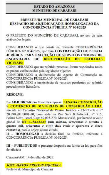 O prefeito de Carauari Airton Siqueira (MDB), vai pagar R$ 1,7 milhão para a empresa Lusada Construção LTDA recuperar estradas de vicinais do município. A Concorrência Pública n° 004/2025 publicada no Diário Oficial dos Municípios (DOM), foi assinada por Siqueira em julho, porém publicada somente agora.