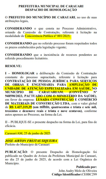 A Prefeitura de Carauari, homologou no dia 25 de junho um contrato milionário com a empresa Lusada Construção e Comércio de Materiais de Construção LTDA, no valor de R$ 1.437.319,39, para a ampliação da Unidade de Atenção Especializada em Saúde no município.