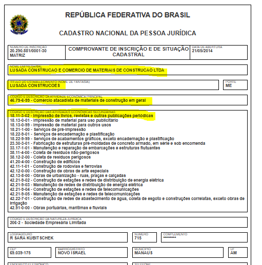 A empresa com a razão social Lusada Construcao e Comercio de Materiais de Construcao Ltda, tem o nome fantasia Lusada Construcoes, opera com o CNPJ 20.290.881/0001-30. O endereço de sua sede está localizada em Manaus. Sua atividade principal é de Comércio atacadista de materiais de construção em geral, e o secundário é impressão de livros, revistas e outras publicações periódicas.