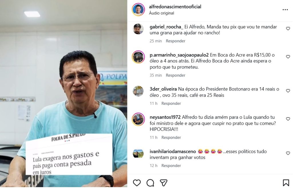 Fazendo a interpretação de uma pessoa que vai às compras, o ex-prefeito diz que Lula está prejudicando o Brasil. Além de ser criticado pela fala, Alfredo foi lembrado que já foi ministro de Lula e Dilma, e que estaria “cuspindo no prato que comeu”.