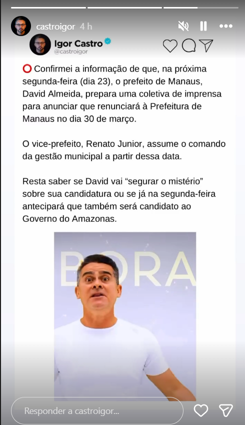 Na noite desta quarta-feira (18), o jornalista e analista Igor Castro publicou que o prefeito anuncia, na próxima segunda-feira, sua saída da Prefeitura, informação que não foi confirmada e nem negada pela assessoria do prefeito.