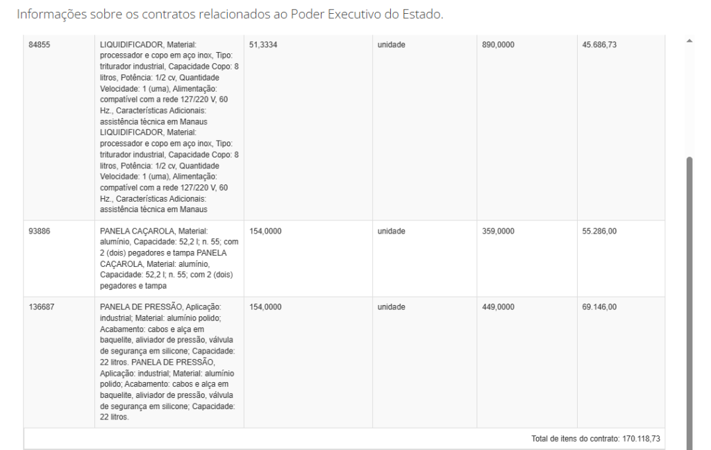 Segundo informações encontradas no Portal da Transparência, a Seduc vai adquirir o montante de 51.333 liquidificadores no valor unitário de R$ 890,00; 154 panelas caçarolas no valor de R$ 359,00 e 154 panelas de pressão no custo unitário de R$ 449,00.