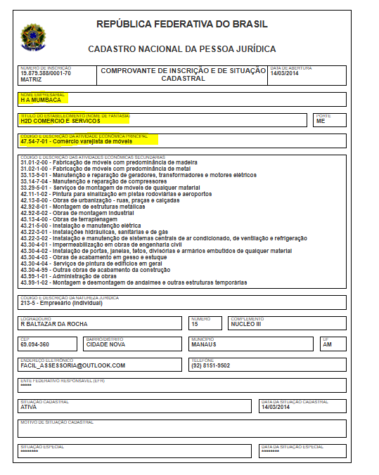 A empresa com a razão social H a Mumbaca, tem o nome fantasia H2d Comercio e Servicos, opera com o CNPJ 19.879.388/0001-70 e foi fundada em 14/03/2014. O endereço de sua sede está localizada na Rua Baltazar da Rocha, 15 – Cidade Nova, Manaus. Sua atividade principal é de Comércio varejista de móveis.