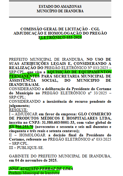 O que mais chama atenção nessa contratação, além do alto valor pago pela Prefeitura de Iranduba à empresa GLO Comércio de Produtos Médicos e Hospitalares Ltda., é a falta de informações no contrato sobre quais equipamentos permanentes estão sendo adquiridos pela gestão municipal e o prazo previsto para a entrega deles.