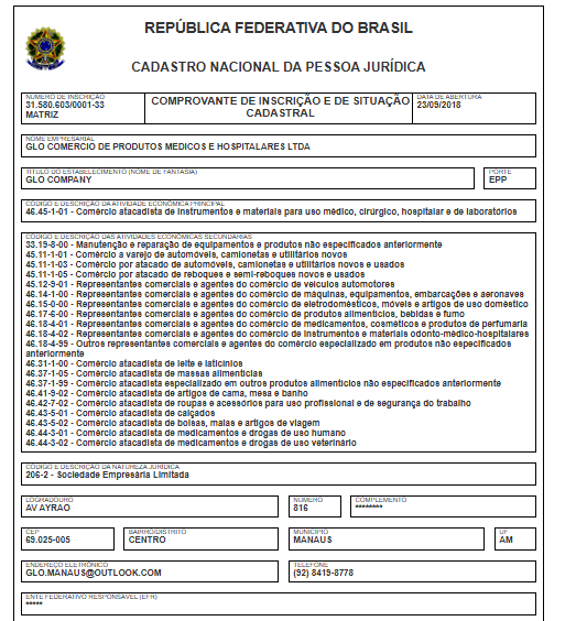 A empresa com a razão social Glo Comercio de Produtos Medicos e Hospitalares Ltda, tem o nome fantasia Glo Company, opera com o CNPJ 31.580.603/0001-33 e foi fundada em 2018. O endereço de sua sede está localizada na Avenida Ayrão, 816 – Centro, Manaus. Sua atividade principal é de Comércio atacadista de instrumentos e materiais para uso médico, cirúrgico, hospitalar e de laboratórios.