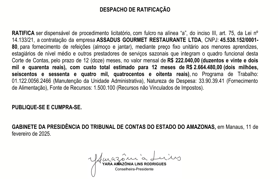 A presidente da Corte de Contas mais importante do Amazonas, conselheira Yara Amazônia Lins, garantiu um belo banquete aos conselheiros do Tribunal de Contas do Estado do Amazonas (TCE-AM). Reeleita como presidente em novembro de 2024, para o biênio 2026-2027, Yara contratou a empresa ASSADUS GOURMET RESTAURANTE LTDA por R$ 2.664.480,00 (Dois milhões, seiscentos e sessenta e quatro mil, quatrocentos e oitenta reais) para fornecer o almoço e o jantar dos chefões.