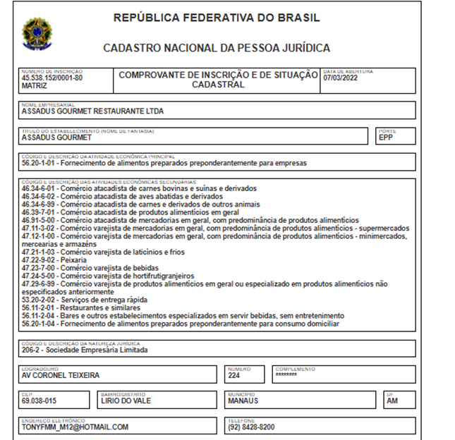 A empresa com a razão social Assadus Gourmet Restaurante Ltda, tem o nome fantasia Assadus Gourmet e opera com o CNPJ 45.538.152/0001-80. O endereço de sua sede está localizado na Avenida Coronel Teixeira, 224 – Lirio do Vale, Manaus – AM. Sua atividade principal é de Fornecimento de alimentos preparados preponderantemente para empresas.