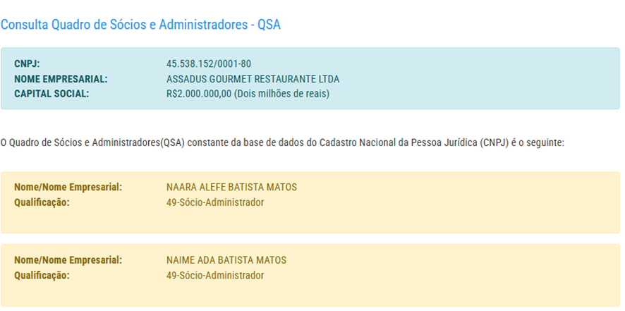 A empresa que existe a pouco mais de 3 anos, possui capital social de R$ 2 milhões e pertence a Naara Alefe Batista Matos e Naime Ada Batista Matos.