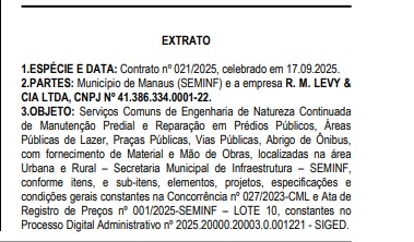 De acordo com informações publicadas no Diário Oficial do Município (DOM), David Almeida por meio da Secretaria Municipal de Infraestrutura (Seminf), contratou a empresa R. M. LEVY & CIA LTDA, pelo valor global de R$ 14.520.000,00 (Quatorze milhões e quinhentos e vinte mil reais), para dar manutenção em áreas públicas como: prédios, áreas de lazer, praças, vias e paradas de ônibus em Manaus.