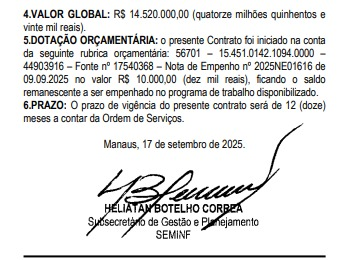 A contratação milionária foi celebrada na quarta-feira (17), porém só tornada pública no fim da tarde da última sexta (26). O documento foi assinado por Heliatan Botelho Correa, subsecretário da Seminf.