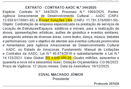 Um contrato no valor global de R$ 4.649.600,00 firmado pela Agência Amazonense de Desenvolvimento Cultural (AADC) chama atenção pelo montante envolvido, pelo objeto contratado e pelo contexto em que a despesa foi autorizada. O extrato do Contrato nº 344/2025, publicado oficialmente, revela que a empresa Ecoart Soluções Ltda., foi contratada para prestar serviços voltados à organização de eventos culturais, artísticos e esportivos no Amazonas.