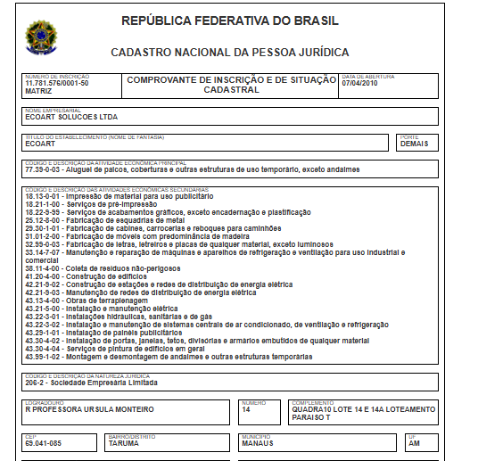 A empresa com a razão social Ecoart Soluções Ltda, tem o nome fantasia Ecoart, opera com o CNPJ 11.781.576/0001-50 e foi fundada em 2010. O endereço de sua sede está localizada na Rua Professora Úrsula Monteiro, 14 – Tarumã, Manaus. Sua atividade principal é de Aluguel de palcos, coberturas e outras estruturas de uso temporário, exceto andaimes.