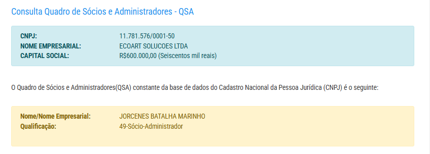 A empresa possui capital social de R$ 600 mil e pertence a Jorcenes Batalha Marinho.