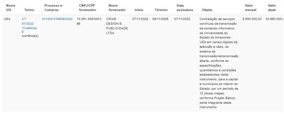 A (UEA) contratou em novembro de 2022 a empresa Criae Design e Publicidade pelo valor de R$ 30.960.000,00. O serviço contratado de acordo com informações publicados era de “Transmissão/Retransmissão do Programa ‘Minuto UEA’ bem como a comunicação de matéria de interesse público UEA para os 62 (sessenta e dois) Municípios do Amazonas em TV aberta”.