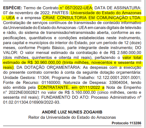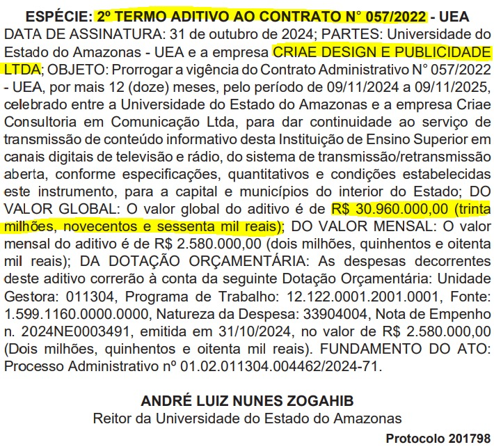 Em outubro do ano passado, a UEA fechou um segundo termo aditivo com a Criae Design e Publicidade pelo mesmo valor do primeiro contrato.