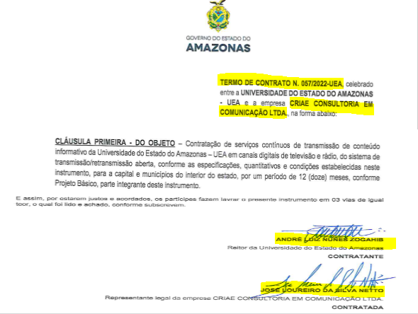 Contratos recorrentes entre a Universidade Estadual do Amazonas (UEA) e a empresa Criae Design e Publicidade, levantam sérias suspeitas de favorecimento. Em novembro de 2022, um contrato milionário com a Criae Design e Publicidade LTDA, foi firmado no valor global de R$ 30.960.000,00 (trinta milhões, novecentos e sessenta mil reais) com vigência de 12 meses. Em 2023 a UEA firmou um termo aditivo no mesmo valor estendo o contrato até 2025, com o aditivo a empresa angariou o valor de R$ 92.880,000,00 (noventa e dois milhões, oitocentos e oitenta mil reais). O acordo entre elas está publicado no Portal da Transparência do governo.