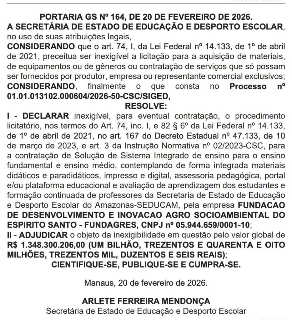 “O Sindicato dos Professores e Pedagogos de Manaus, vem a público para depositar completo apoio à decisão histórica tomada, no dia de hoje ( 24/03/26 ), pelo Tribunal de Contas do Estado do Amazonas de RECOMENDAR o afastamento da atual Secretária de Educação do Estado, Sra. Arlete Mendonça, de suas funções, para facilitar a continuidade das investigações sobre o suspeitíssimo contrato bilionário efetuado, pela Sra. Secretária, com uma empresa do agronegócio para fornecer serviços e materiais pedagógicos para a Seduc/Am”