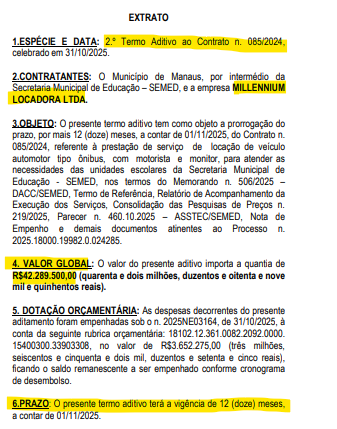 O aditivo prorrogado por mais 12 meses, a partir de 1º de novembro, é para contrato de locação de veículos automotores tipo ônibus, incluindo motorista e monitor, para atender às necessidades da rede escolar municipal.