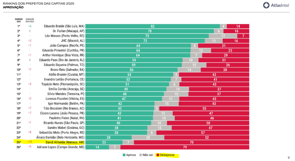 Uma nova pesquisa nacional realizada pela empresa AtlasIntel e divulgada na última sexta-feira (19), afirma que o prefeito de Manaus,David Almeida (Avante), ocupa o 2° lugar de pior prefeito do País e possui uma taxa de rejeição de aproximadamente 70%.