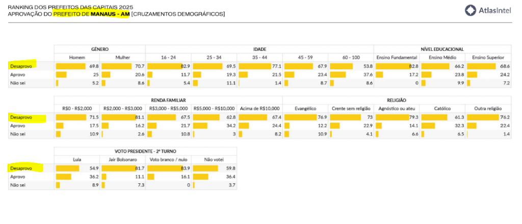 A análise dos dados demográficos em Manaus revela os segmentos em que a gestão municipal encontra maior rejeição. Entre jovens de 16 a 24 anos, a desaprovação chega a 82,9%, enquanto entre eleitores com Ensino Fundamental completo o índice é de 82,8%.