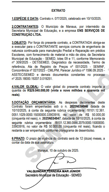 De acordo com o Extrato do Contrato nº 077/2025, o acordo foi celebrado no dia 10 de outubro, mas só foi tornado público 11 dias depois. Ainda, o documento foi assinado pelo secretário municipal de Educação, Valquindar Ferreira Mar Júnior, e terá vigência de 12 meses a partir da assinatura.