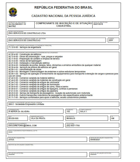 A empresa com a razão social Ens Servicos de Construção Ltda, tem o nome fantasia Ens Servicos de Construção, opera com o CNPJ 34.334.366/0001-19 e foi fundada em 2019. O endereço de sua sede está localizada na Rua Neper da Silveira, 153 – Vila da Prata, Manaus. Sua atividade principal é de Serviços de engenharia.