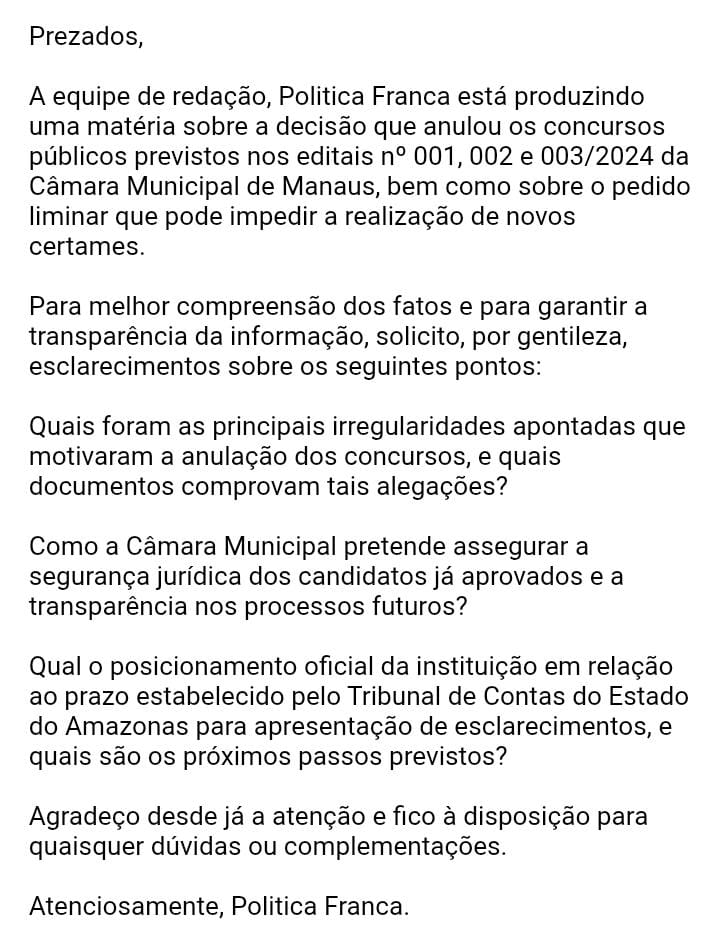 A equipe de reportagem Politica Franca entrou em contato com o TCE-AM, CMM e DPE-AM em busca de esclarecimentos, mas até o presente momento não obtivemos retorno.