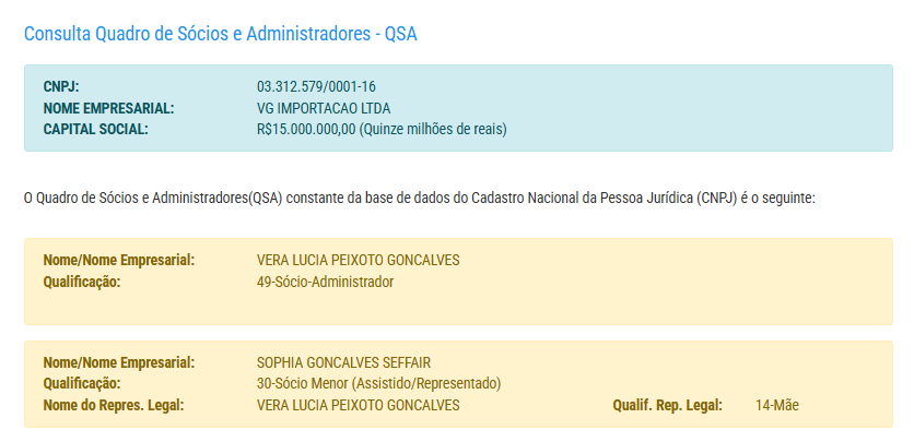 A empresa possui capital social de R$ 15 milhões e pertence a Vera Lúcia Peixoto Gonçalves e Sophia Gonçalves Seffair.