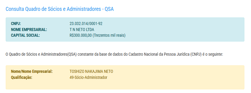 A empresa tem capital de R$ 300 mil reais e pertence a Toshizo Nakajima Neto.