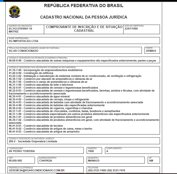 A empresa com a razão social Vg Importacao Ltda, tem o nome fantasia Vg Ar Condicionado, opera com o CNPJ 03.312.579/0001-16 e foi fundada em 23/07/1999. O endereço de sua sede está localizada na Avenida Pedro Teixeira, 1000 – Chapada, Manaus. Sua atividade principal é de Comércio atacadista de outras máquinas e equipamentos não especificados anteriormente