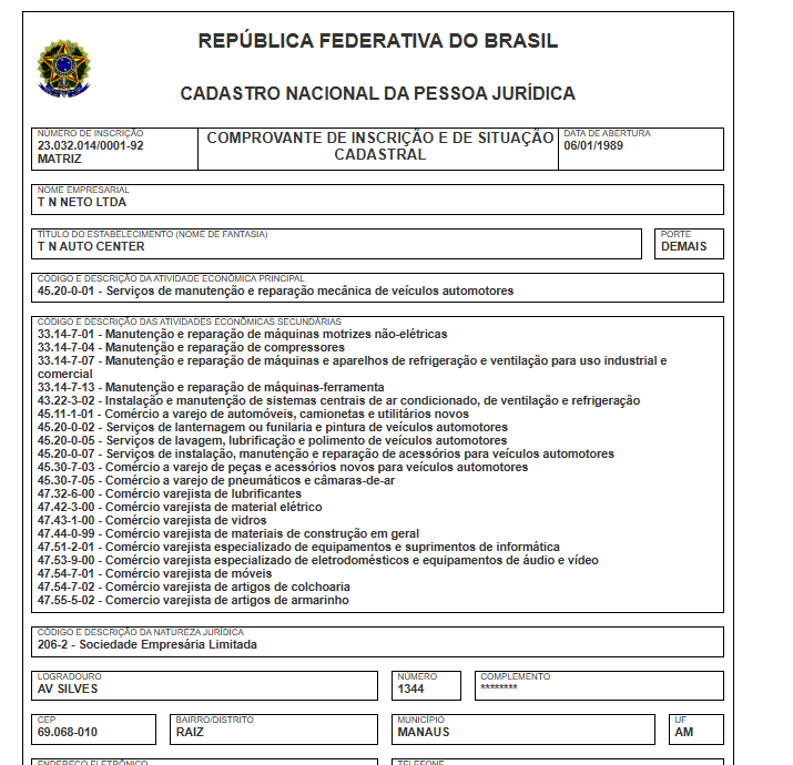 A empresa com a razão social T N Neto Ltda, tem o nome fantasia T N Auto Center, opera com o CNPJ 23.032.014/0001-92 e foi fundada em 06/01/1989. O endereço de sua sede está localizada na Avenida Silves, 1344 – Raiz, Manaus. Sua atividade principal é de Serviços de manutenção e reparação mecânica de veículos automotores.