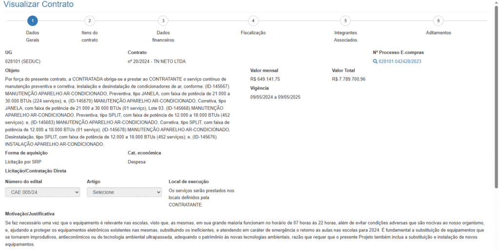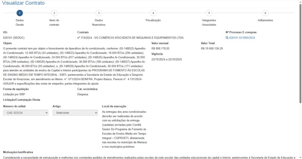 - Contrato nº 174/2024 – Com a empresa VG Comércio Atacadista, no valor total de R$ 10.658.136,29, para o fornecimento de 1.970 aparelhos de ar-condicionado de diversas potências, destinados a escolas da capital e interior.