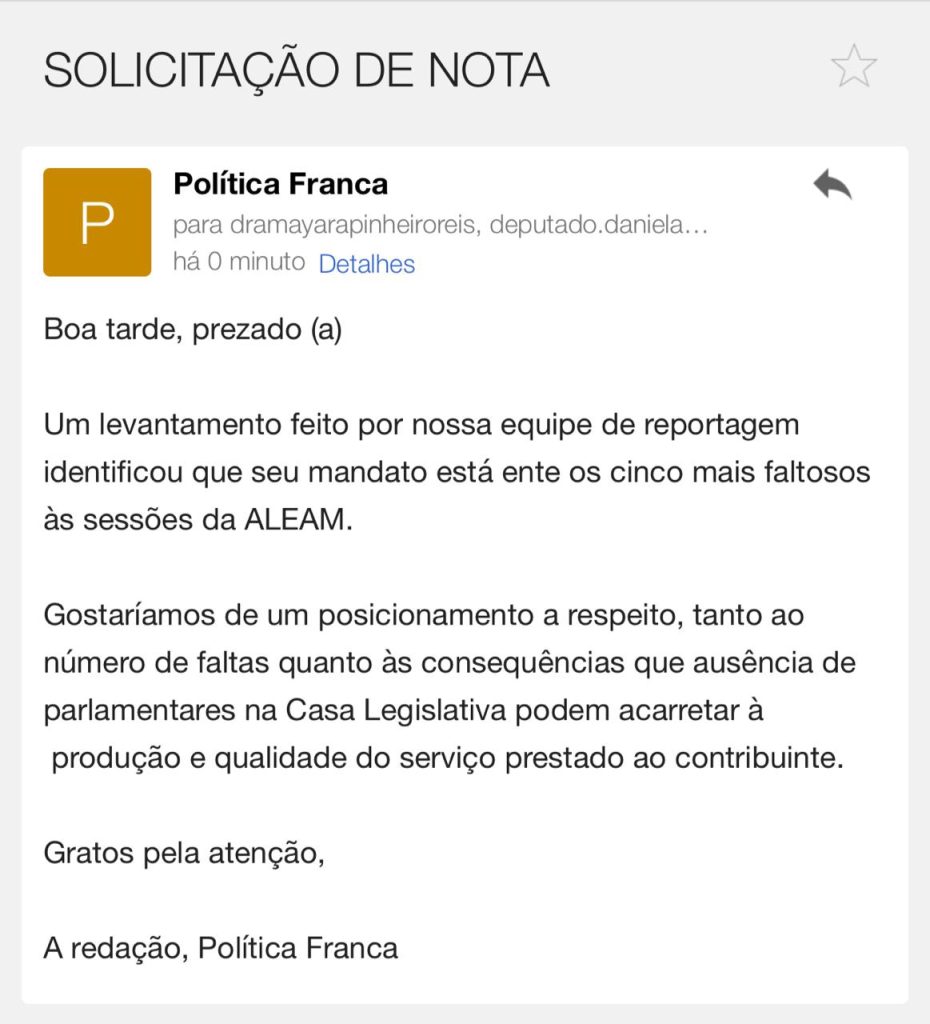 A lista dos cinco mais faltosos inclui duas mulheres e o presidente da Assembleia Legislativa do Amazonas (Aleam). Os dados de todos estão disponíveis no próprio site da Casa, no SAPL.