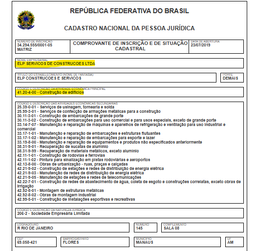 A empresa com a razão social Elp Serviços de Construções Ltda, tem o nome fantasia Elp Construções e Serviços, opera com o CNPJ 34.294.555/0001-05 e foi fundada em 23/07/2019. O endereço de sua sede está localizada na Rua Rio de Janeiro, 145 – Flores, Manaus. Sua atividade principal é de Construção de edifícios.