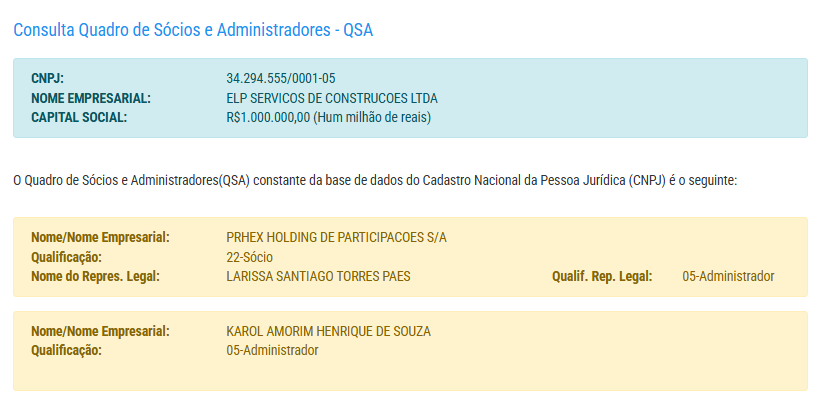 A empresa possui capital de R$ 1 milhão e pertence as empresárias Larissa Santiago Torres Paes e Karol Amorim Henrique de Souza.