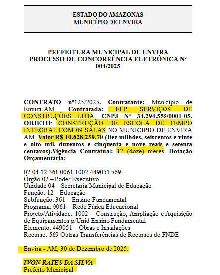 Conforme o documento da Concorrência Eletrônica nº 004/2025, publicado no Diário Oficial dos Municípios (DOM), os milhões que serão retirados dos cofres públicos de Envira, é para construir uma Escola de tempo integral no município, com recursos do Fundo Nacional de Desenvolvimento de Educação (FNDE).