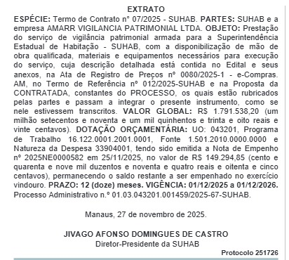 O diretor e presidente, Jivago Castro, da Superintendência Estadual de Habitação (SUHAB), vai gastar R$ 1,7 milhão com a empresa Amarr Vigilância LTDA, em serviço de vigilância patrimonial armada.