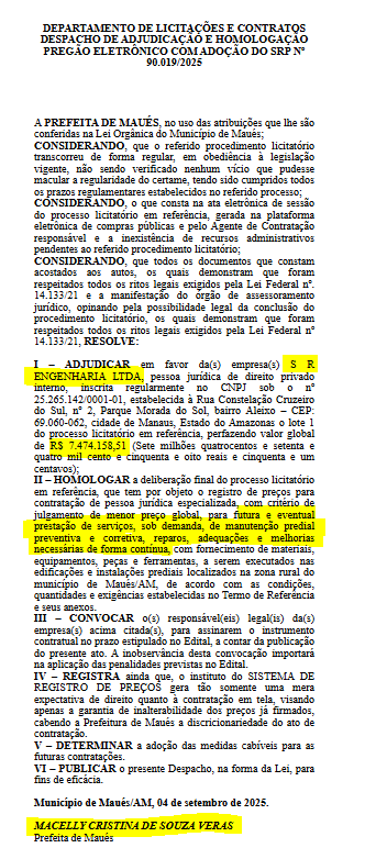 O documento publicado no Diário Oficial dos Municípios (DOM), foi em favor da empresa S.R ENGENHARIA LTDA que vai arrematar os R$ 7.474.158,51 (Sete milhões, quatrocentos e setenta e quatro mil, cento e cinquenta e oito reais e cinquenta e um centavos) para prestar os serviços sob demanda.