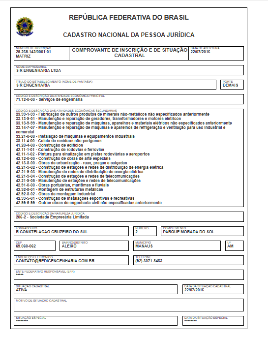 A empresa com a razão social S R Engenharia Ltda, tem o nome fantasia S R Engenharia, opera com o CNPJ 25.265.142/0001-01. O endereço de sua sede está localizada na Rua Constelação Cruzeiro do Sul, 2 – Aleixo. Sua atividade principal é de Serviços de engenharia.