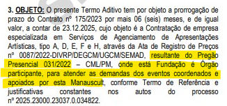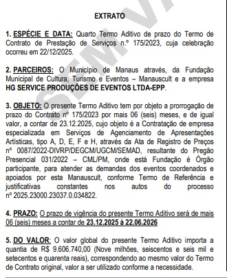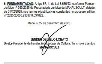Conforme as informações oficiais, no documento, a Manauscult justifica que o montante corresponde “ao mesmo valor do contrato original, que segue sendo executado conforme a necessidade da administração pública”.
