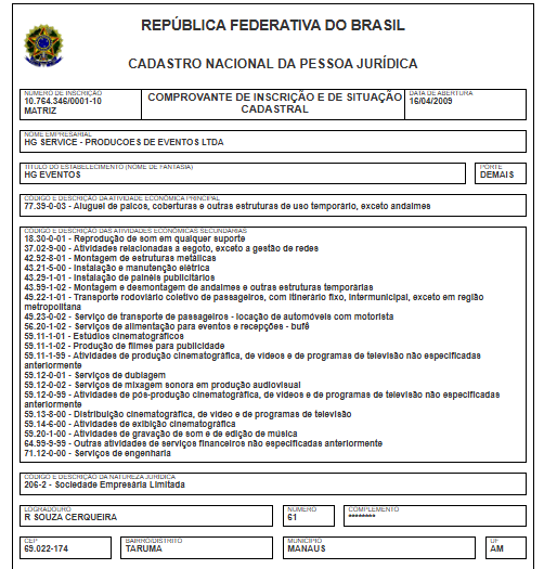 A empresa com a razão social Hg Service – Produções de Eventos Ltda, tem o nome fantasia Hg Eventos, opera com o CNPJ 10.764.346/0001-10 (10764346000110) e foi fundada em 2009. O endereço de sua sede está localizada na Rua Souza Cerqueira, 61 – Tarumã, Manaus. Sua atividade principal é de Aluguel de palcos, coberturas e outras estruturas de uso temporário, exceto andaimes.