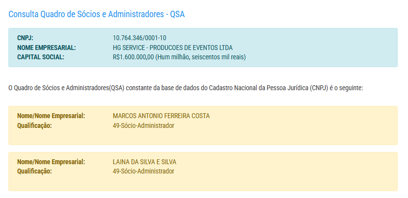 A empresa possui capital de R$ 1,6 milhão, tendo como sócios Marcos Antônio Ferreira Costa e Laina da Silva e Silva.