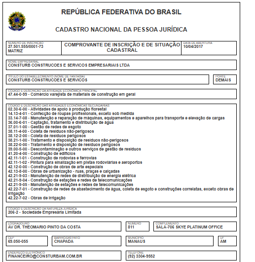 A empresa com a razão social Conturb Construções e Serviços Empresariais Ltda, tem o nome fantasia Consturb Construções e Serviços, opera com o CNPJ 27.501.555/0001-73 e foi fundada em 10/04/2017. O endereço de sua sede está localizada na Avenida Dr. Theomario Pinto da Costa, 811 – Chapada, Manaus – AM, 69.050-055. Sua atividade principal é de Comércio varejista de materiais de construção em geral.