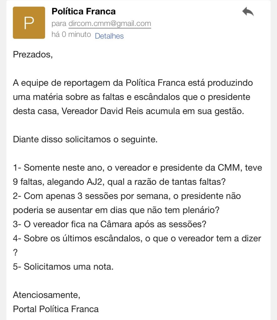 Nossa equipe de reportagem encaminhou um pedido de solicitação de nota sobre as faltas e escândalos na gestão de Reis na Câmara.