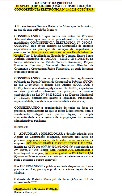 Segundo a publicação oficial, a empresa WR Engenharia foi contemplada, pelo Executivo Municipal e a creche será construída na Estrada do Caruara, no bairro Santo Antônio, em Jutaí.