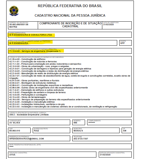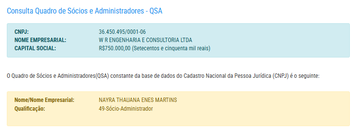 Inscrita no CNPJ 36.450.495/0001-06, a empresa WR Engenharia e Consultoria LTDA é localizada na Avenida Silves, bairro Raiz, zona Sul de Manaus. Ela tem como principal atividade serviços de engenharia, é administrada por Nayra Thauana Enes Martins, e possui capital social de R$ 750 mil.