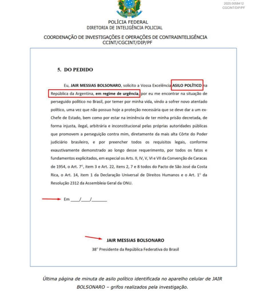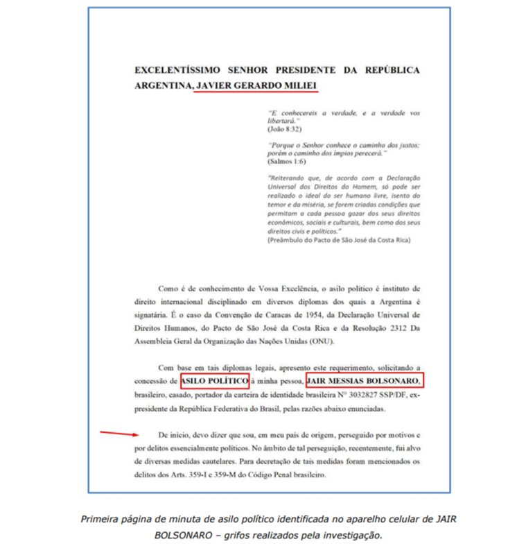 Conforme a Polícia Federal, a desconfiança surgiu a partir de um arquivo localizado no telefone celular de Bolsonaro. O conteúdo seria um esboço de carta destinada ao presidente da Argentina, Javier Milei, na qual o ex-mandatário pedia concessão de asilo político.