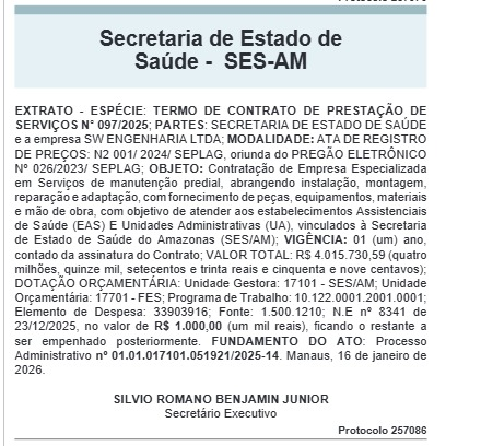 A Secretaria de Estado de Saúde do Amazonas (SES-AM) firmou um contrato que ultrapassa R$ 4 milhões para serviços de manutenção predial e fornecimento de peças de instalação e reparação da rede estadual. O acordo foi assinado em 16 de janeiro de 2026, sob o comando da secretária de Saúde, Nayara Maksoud, dentro da estrutura administrativa do governo Wilson Lima (União Brasil).